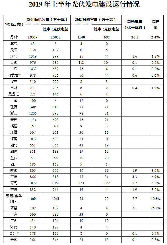 全国各省(区、市)2019年上半年光伏发电建设运行情况详见附表。