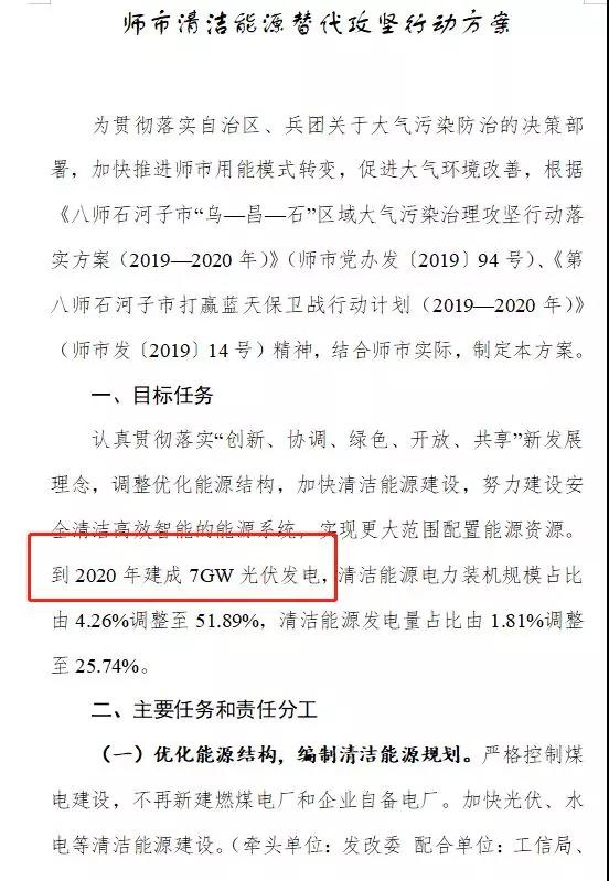 近日,石河子市出台清洁能源替代攻坚行动方案。提出到2020年底建成7GW光伏发电,清洁能源电力装机规模占比由4.26%调整至51.89%,清洁能源发电量占比由1.81%调整至25.74%。