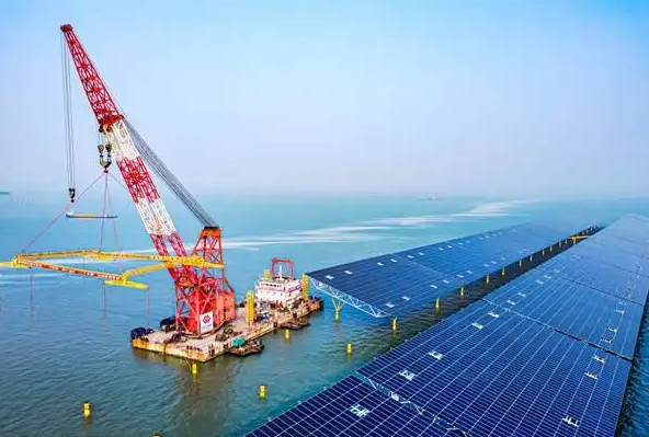 碧海蓝天间,海上光伏平台吊装作业正有序推进。