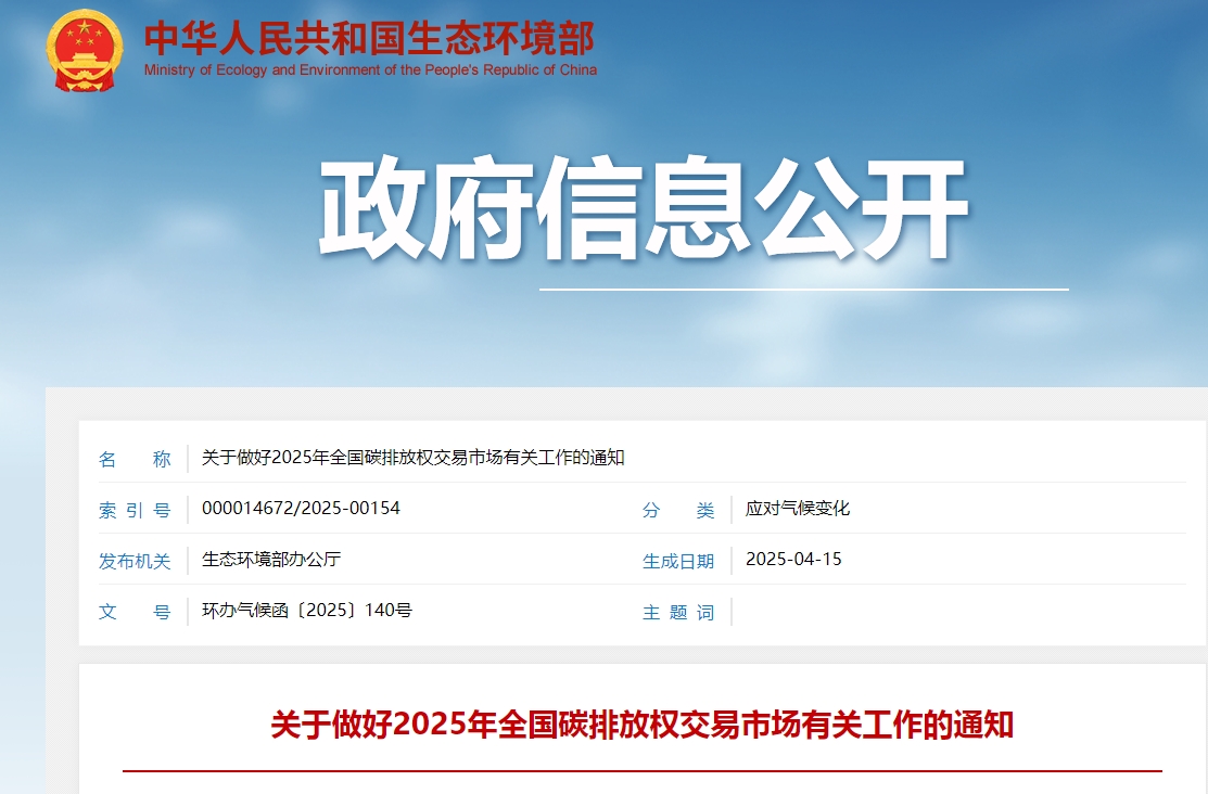 为统筹做好2025年全国碳排放权交易市场管理工作,保障市场健康平稳有序运行。生态环境部印发《关于做好2025年全国碳排放权交易市场有关工作的通知》。