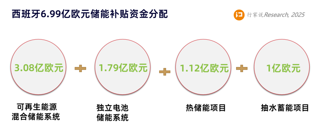 近期,欧盟已批准西班牙针对储能领域的近7亿欧元(约合58.05亿元人民币)补贴计划,其中单个项目最高可获85%的资本补贴额度。项目申报需在2029年底前完成建设并投入运营。目标到2029年新增2.5-3.5GW储能容量,覆盖80-120个重点工程项目,重点支持三大领域。