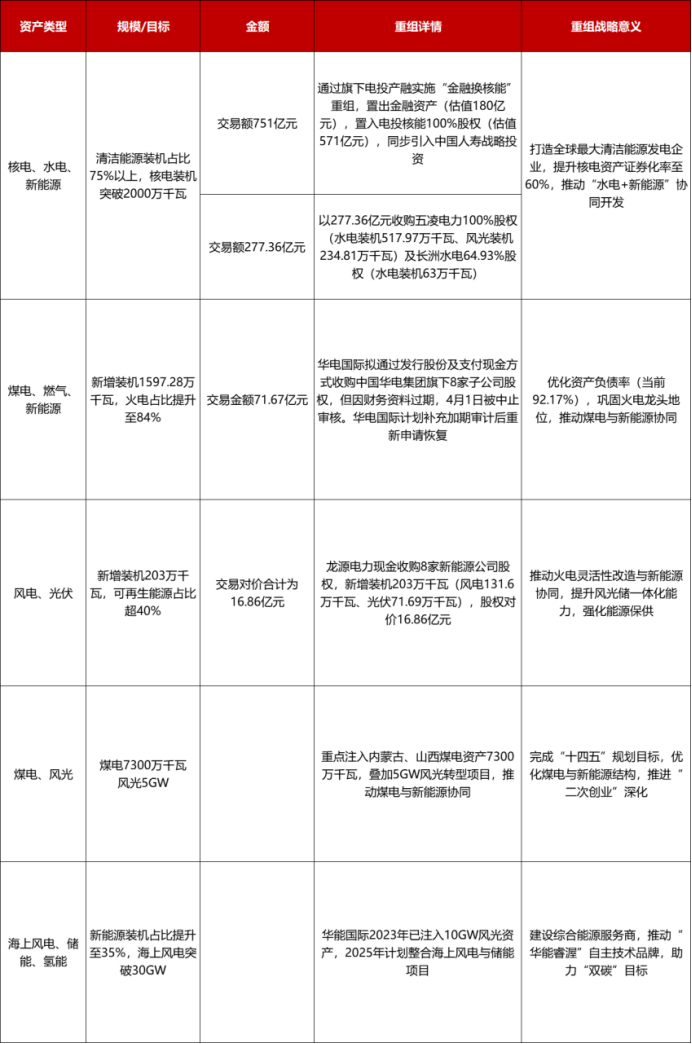 仅2025年一季度,国能、华能、国电投、华电、大唐就已启动超千亿元规模重组项目,涉及核电、新能源、煤电等核心资产优化配置,推动行业向清洁化、集约化转型。