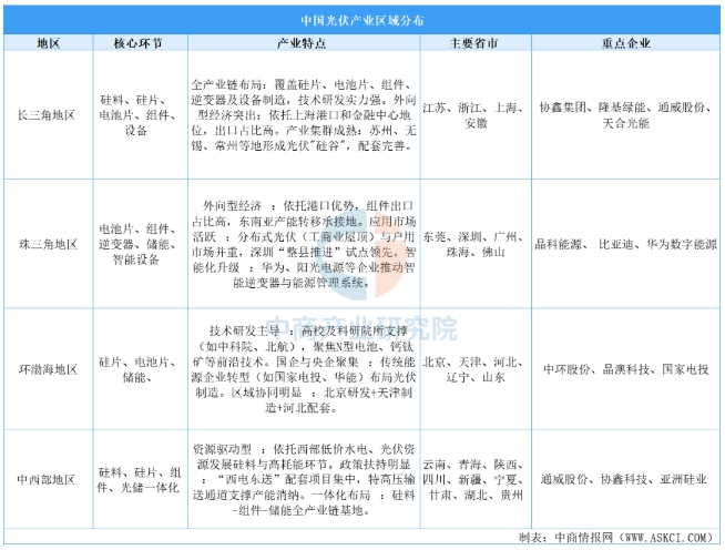 中国光伏产业已形成四大核心区域差异化布局:长三角地区以全产业链协同与技术创新为核心,覆盖硅料、硅片、电池片、组件及设备制造,依托江苏、浙江、安徽的龙头企业及高校科研优势,出口占比高;珠三角地区以外向型经济与智能化升级为特色,依托晶科、比亚迪、华为等企业,组件出口占比高,并布局分布式光伏与智能逆变器;环渤海地区聚焦技术研发与国企转型,北京、天津、山东依托中科院等科研力量发展N型电池、钙钛矿技术,中环股份、晶澳科技等企业推动硅片与储能协同;中西部地区则依托水电与政策优势,云南、青海、陕西等地发展高耗能硅料环节及光储一体化,通威、协鑫等企业构建“硅料-组件-储能”全产业链,通过特高压消纳产能。四大区域通过资源禀赋、技术迭代与政策协同,形成覆盖研发、制造、应用的完整产业生态。
