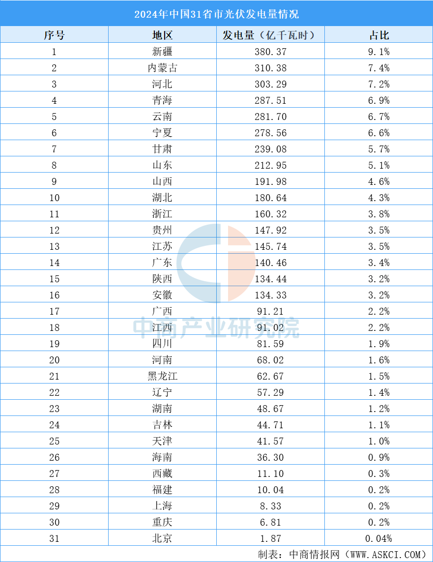 光伏发电量主要集中在中西部、东南沿海省市。其中,新疆光伏发电量380.37亿千瓦时,占比9.1%。内蒙古、河北光伏发电量超300亿千瓦时,占比分别为7.4%、7.2%。青海、云南、宁夏、甘肃、山东光伏发电量超200亿千瓦时,占比均超5%。