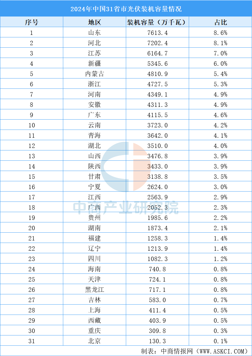 光伏装机量主要集中在东部沿海、中西部地区。2024年山东光伏装机容量最高达7613.4万千瓦,占比8.6%。河北紧随其后,光伏装机容量占比8.1%。江苏、新疆、内蒙古、浙江、河南、安徽、广东光伏装机容量超4000万千瓦,占比分别为7.0%、6.0%、5.4%、5.3%、4.9%、4.9%、4.6%。