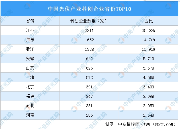 光伏产业技术迭代速度迅猛,属于科技含量较高的成长性行业。目前,光伏产业链中,科创企业主要集中在江苏、广东、浙江三省。据不完全统计,全国科创企业1.12万家。江苏科创企业占比25.02%,广东省占比14.70%。