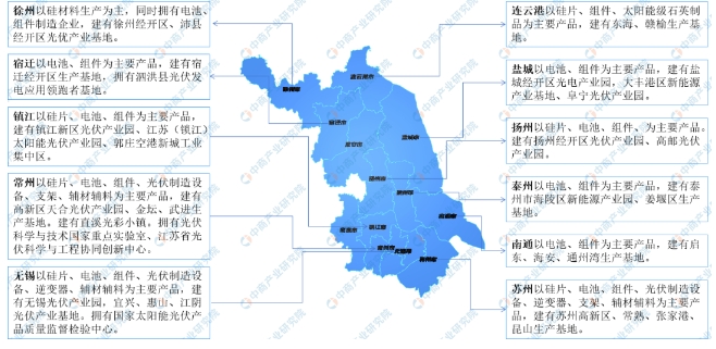 江苏光伏产业主要集中在常州、盐城、苏州、无锡、徐州、宿迁、镇江、连云港、扬州、泰州、南通,形成了常州、无锡、常熟、镇江、扬州、盐城等多个光伏产业聚居区。