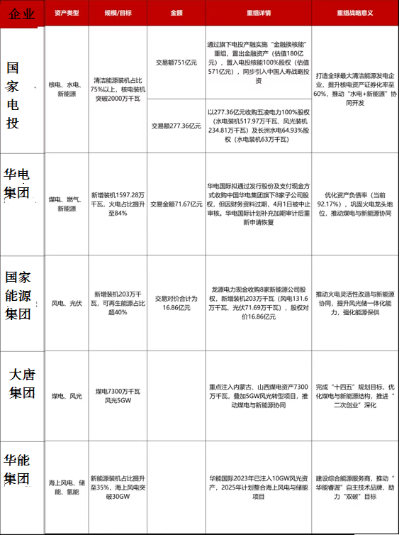 大唐集团:2025年,大唐集团斥资53.44亿元回购辽宁、河北、内蒙古等五家新能源及水电公司股权,并计划注入7300万千瓦未上市煤电资产,配套5GW风光项目,推动煤电与新能源协同转型。