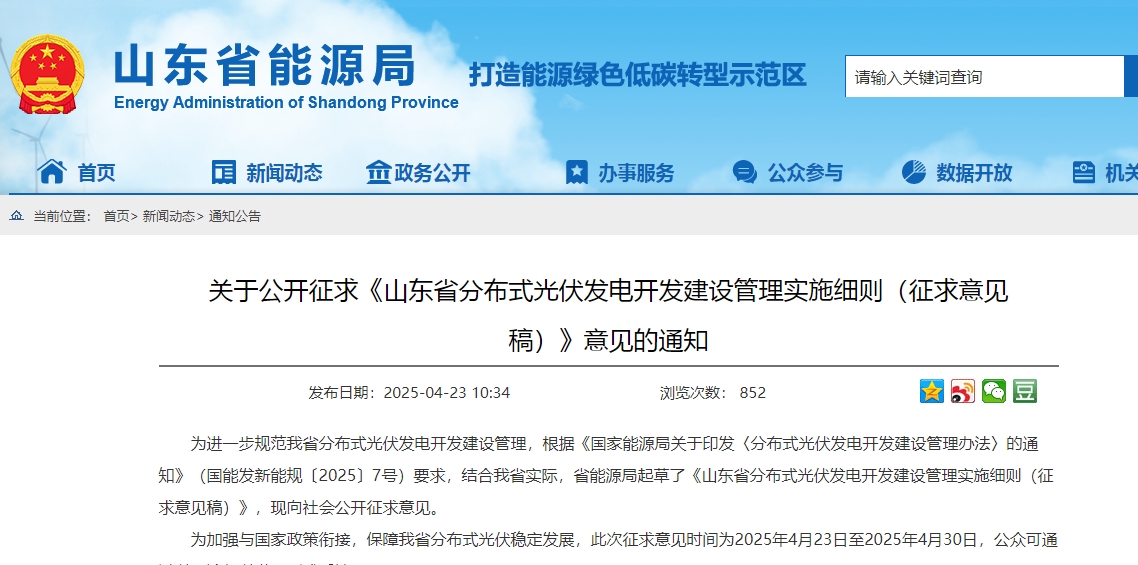 为进一步规范我省分布式光伏发电开发建设管理,根据《国家能源局关于印发〈分布式光伏发电开发建设管理办法〉的通知》(国能发新能规〔2025〕7号)要求,结合我省实际,省能源局起草了《山东省分布式光伏发电开发建设管理实施细则(征求意见稿)》,现向社会公开征求意见。