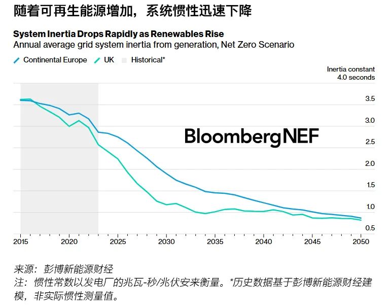 彭博新能源财经的净零情景中,2020-2050年欧洲电力系统惯性的年均降幅
