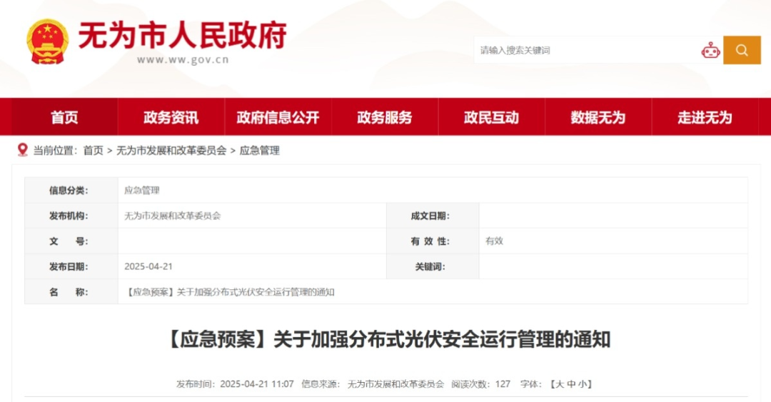 近日,无为市发展和改革委员会发布《【应急预案】关于加强分布式光伏安全运行管理的通知》(以下简称《通知》)