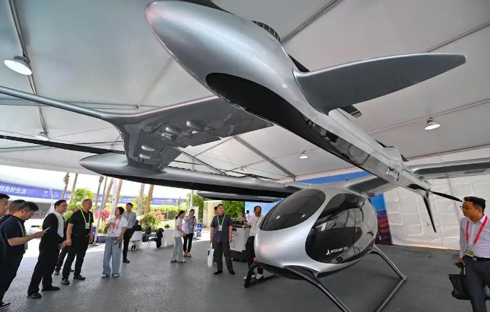 在近日举行的第五届中国国际消费品博览会上,首次设立低空经济展示专区,图为观众在观看一款电动垂直起降固定翼运载型无人机。新华社记者 郭程 摄