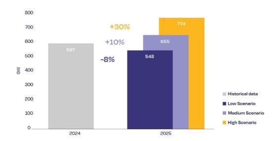 报告提出了三种预测情景:最可能实现的"中情景"为655吉瓦,"高情景"可达774吉瓦,"低情景"则可能降至548吉瓦。报告指出:"贸易冲突升级可能增加系统成本、延缓项目审批,特别是在价格敏感市场。欧盟27国若不能及时完善政策框架,市场可能从停滞转向萎缩。"