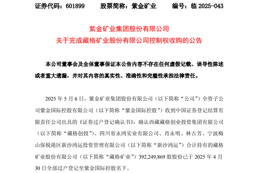 公告称,2025年5月6日,公司全资子公司紫金国际控股收到中国证券登记结算有限责任公司出具的《证券过户登记确认书》,确认西藏藏格创业投资集团有限公司、四川省永鸿实业有限公司、肖永明、林吉芳等合计持有的藏格矿业392,249,869股股份已于2025年4月30日全部过户登记至紫金国际控股名下。