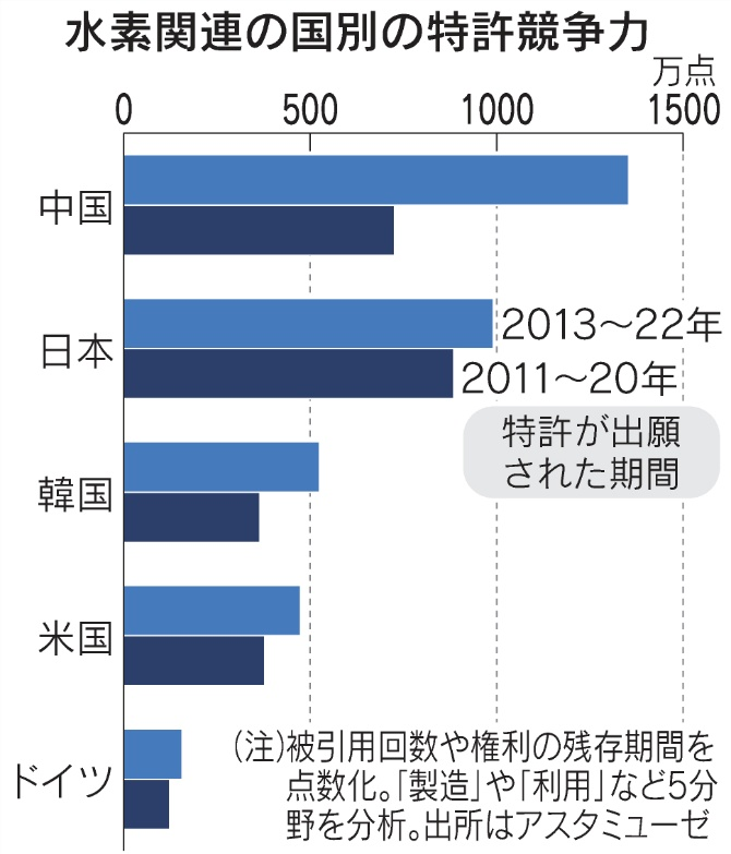 近日,日本经济新闻社旗下的数据分析公司围绕不同国家的“氢能相关的专利竞争力”进行了评分。该评分的计算方法为:在氢能产业链的“制取”“储存”“运输与供应”“安全管理”和“应用”等五个领域的专利数量的基础上,结合各项专利的“可行性”和“剩余权益期限”等标准进行打分,从而得到一国“氢能相关的专利竞争力”的综合点数。