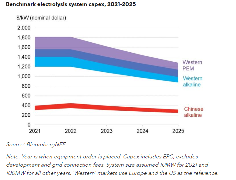 中国在制造领域的优势尤为明显,随着制造设备的规模不断扩大,系统效率不断提升,成本逐渐下降。据美国彭博新能源财经(Bloomberg NEF)数据显示,2023年,中国企业的电解槽制造成本仅为欧洲企业的四分之一,虽然2024-2025年欧美企业有望实现大幅降本但中国企业依然保持大幅领先。