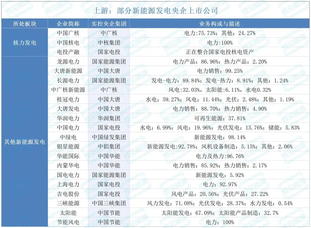 首先是上游新能源发电环节,发电是新能源产业链的起点。从光伏到风电,从核能到水电,央企作为能源电力的主力军,在发电环节有许多央企旗下的上市公司。