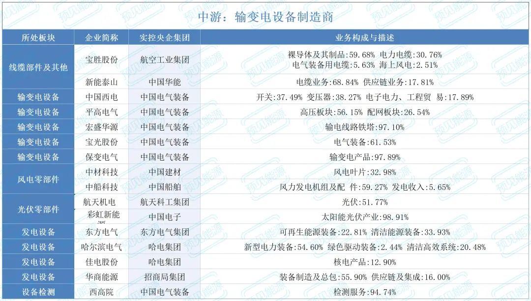 在新能源重要中游,央企旗下公司主要是负责一些输变电装备以及新能源零部件装备、发电装备。从风电叶片到变压器、从断路器到换流阀,中游装备制造是保障新能源并网和高效传输的基础环节。在当前在“风光火储+大电网”模式下,输变电设备不仅保障电力稳定,还提升了新能源就地消纳能力。