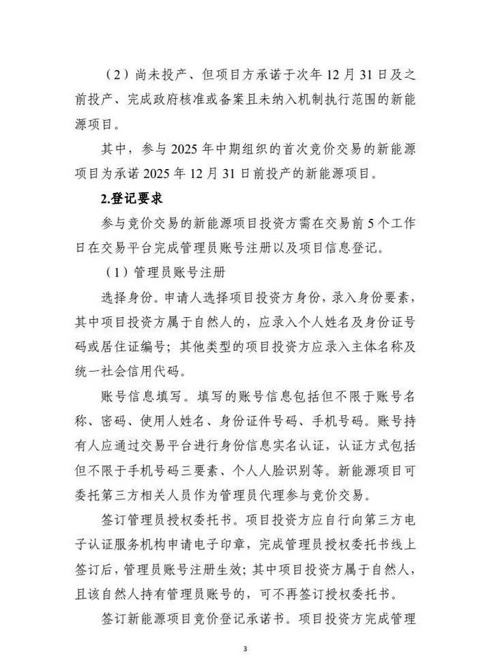 根据文件,2025年中期将组织首次竞价交易,范围为2025年6月1日后投产、核准、备案的新能源项目,参与首次竞价的项目需在2025年12月31日前投产。