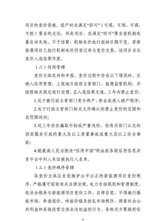 投产时未满足“四可”(可观、可测、可调,可控)要求的光伏、风电项目,在满足“四可”要求前机制电量自动失效、不予结算,机制电价执行起始日期不变。若新能源项目已执行机制电价仍登记参与竞价交易,该项目当次竞价入选结果作废。