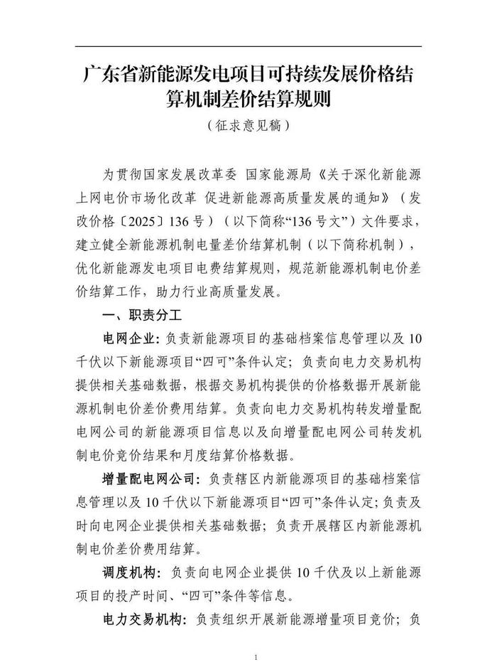 日前,广东省电力交易中心印发《广东新能源增量项目可持续发展价格结算机制竞价规则(征求意见稿)》以及及《广东省新能源发电项目可持续发展价格结算机制差价结算规则(征求意见稿)》,就广东省新能源竞价细则给出有关要求。