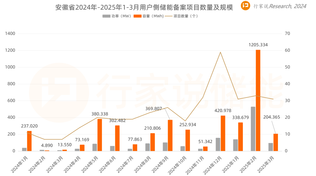 据行家说储能统计,2025年1-3月安徽用户侧储能备案项目共计94个,总规模规模约为757.298MW/1748.378MWh(26个未透露容量),容量已占去年全年备案项目容量的72.72%(去年为2404.179MWh)。