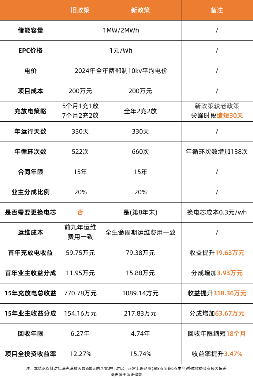 据弘正储能以安徽1MW/2MWh工商业储能电站,EPC价格1元/Wh,项目成本200万元为例,根据新旧政策对比可以看到,15年充放电总收益提升318.36万元,回收年限缩短18个月(见下表)。