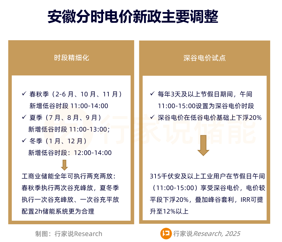 此外,安徽省还发布工商业峰谷分时电价新政策,调整增加2-3小时午间低谷时段,试行节假日深谷电价。政策同步设定市场交易电价浮动范围,明确发电企业报价不得超过基准价±20%,储能项目参与电力市场交易时收益稳定性增强。
