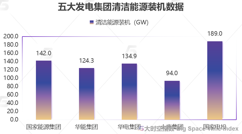 从清洁能源装机数据来看,国家电投189GW处于绝对领先,其次为国家能源集团(142GW)、华能集团(124.3GW)、华电集团(134.9GW)、大唐集团(94GW)。