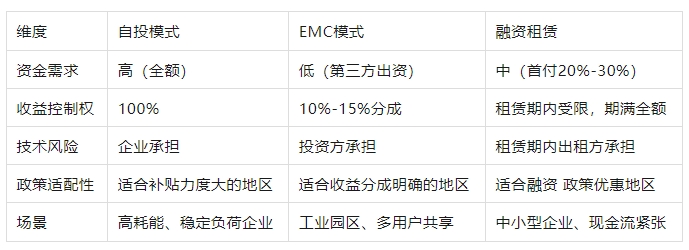 资金实力:现金流充裕且融资成本低的企业优先自投;反之选择EMC或融资租赁。