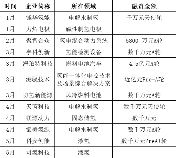 此外,天芮科技、镁源动力、锦美氢源、科安创能、司氢科技、宇科创新、海珀特科技、溯驭技术、协氢新能源、聚智合众、力炻电极、锋华氢能超过12家氢能企业获得融资,引发行业广泛关注。