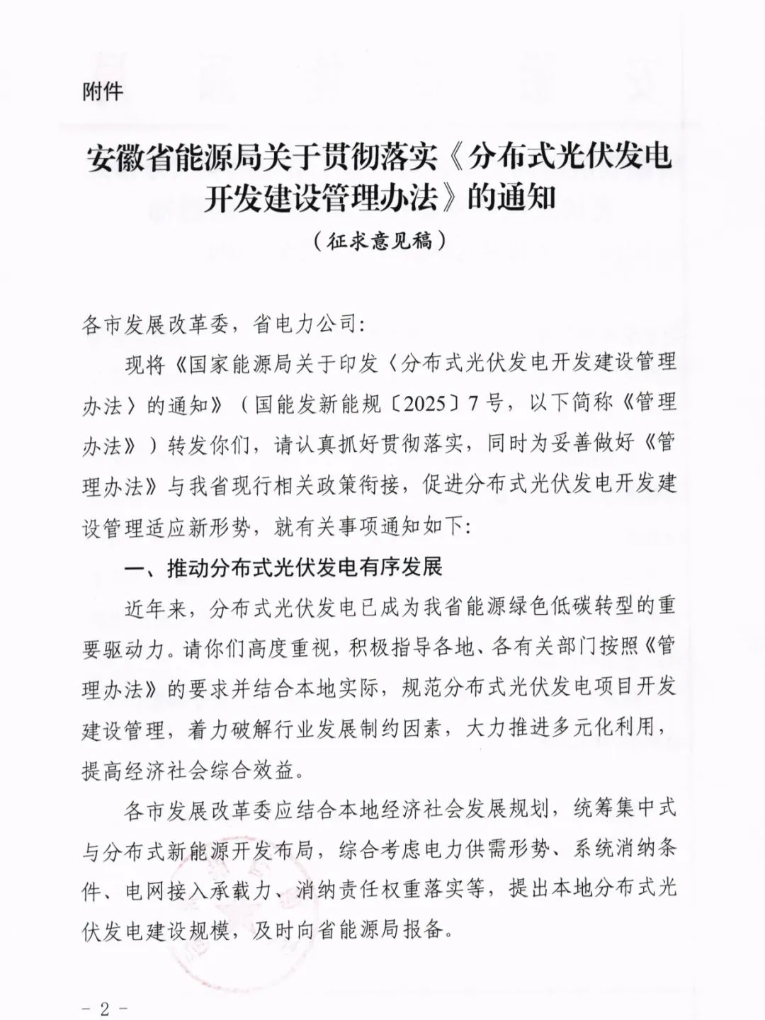 5月20日,安徽省能源局发布关于征求 《关于贯彻落实 (分布式光伏发电开发建设管理办法〉的通知(征求意见稿)》 意见的函。