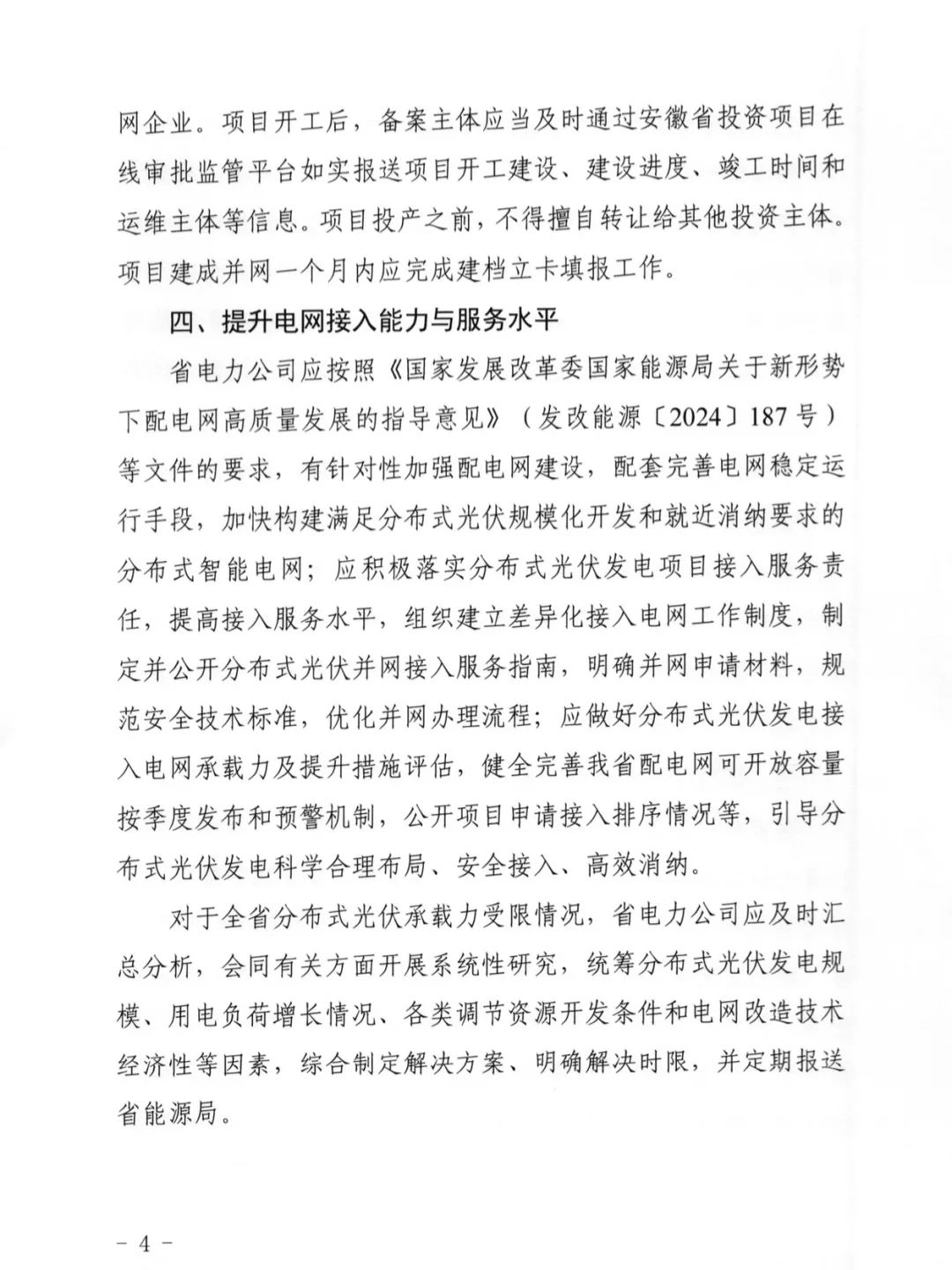 在备案方面,各市发展改革委要加强对属地各案工作的指导,不得以统筹开发、市场整顿、容量限制等为由暂停或暂缓项目各案,确因拆迁移民规划、乡村风貌保护等原因暂不宜开展分布式光伏项目建设的,应依法向社会公开,并在办理各案时告知各案主体及电网企业。项目开工后,备案主体应当及时通过安徽省投资项目在线审批监管平台如实报送项目开工建设、建设进度、竣工时间和运维主体等信息。项目投产之前,不得擅自转让给其他投资主体。项目建成并网一个月内应完成建档立卡填报工作。