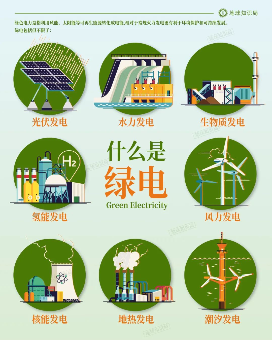 绿电指的是用清洁能源发电,包括但不限于水力发电、光伏发电、风力发电、核能发电等。