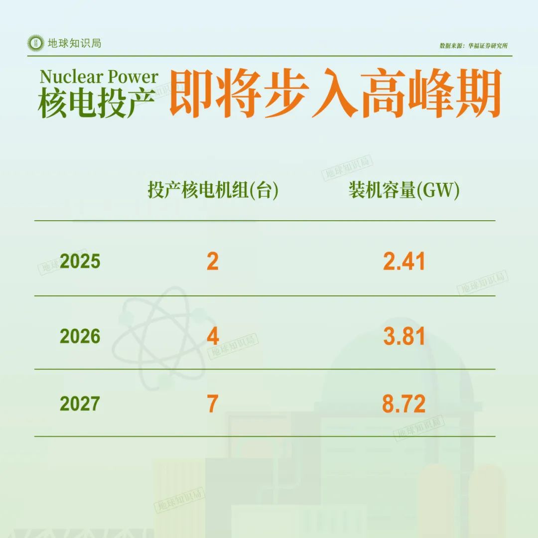 按照核准数量和建造周期,预计2025-2027年投产核电机组规模逐渐增大,核电投产即将步入高峰期。