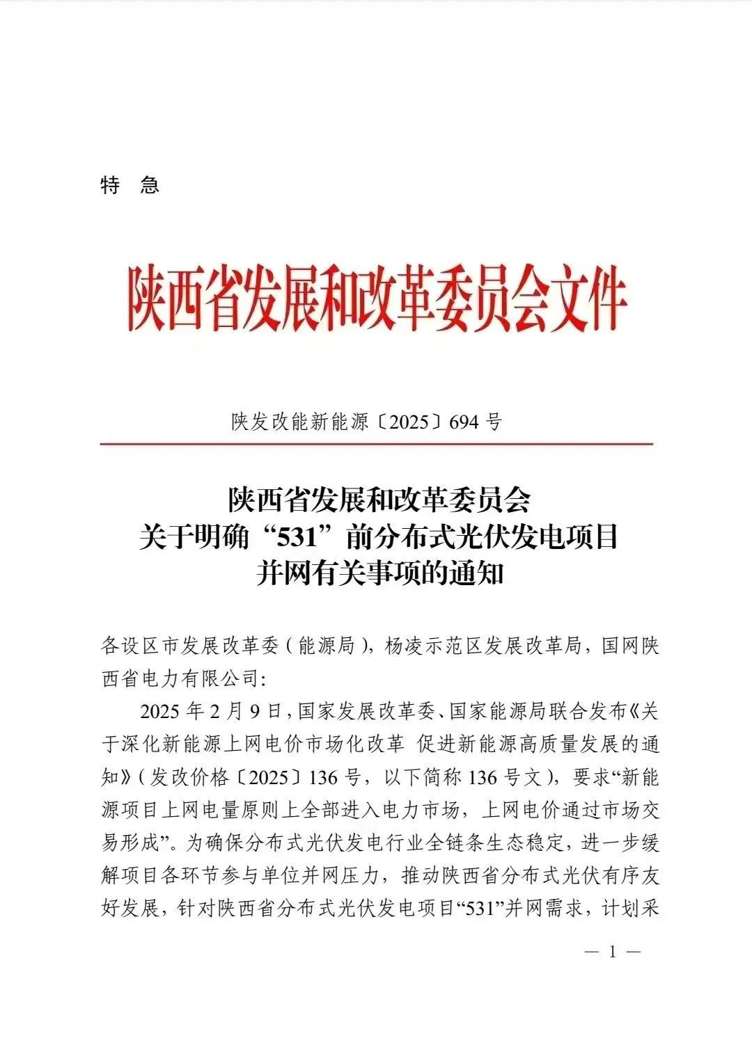 根据陕西省发改委5月20日发布的紧急通知,针对接入容量不足的分布式光伏项目推出限发并网机制: