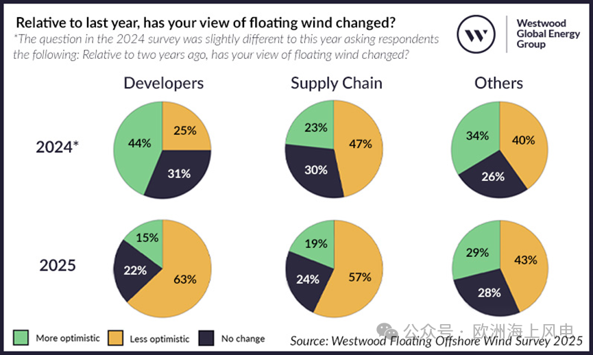 此次调查共有166家企业或机构参与,包括开发商、供应链、政府部门、工程专家。所有群体的乐观比例较去年都有下降,而悲观比例都在上升,特别是开发商,63%的开发商对浮式风电持悲观态度,由去年的25%飙升;72%的受访者认为,技术瓶颈与资金压力将导致2030年装机量不足3GW。