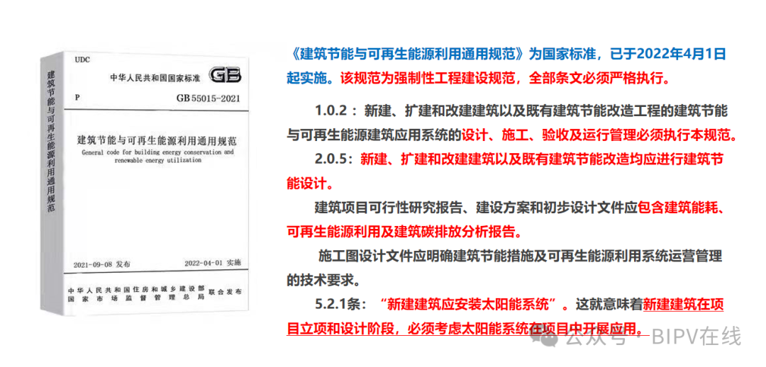 在房地产行业整体步入调整期的背景下,BIPV(建筑一体化光伏)行业却呈现出截然不同的发展态势。这一现象的首要驱动力来自于国家层面的政策刚性要求。随着"双碳"战略的深入推进,建筑领域作为碳排放的重要来源,已成为政策调控的重点对象。《建筑节能与可再生能源利用通用规范》GB55015的颁布实施,首次从国家层面明确要求新建建筑必须安装光伏系统,这一强制性规范为BIPV市场提供了坚实的政策基础。