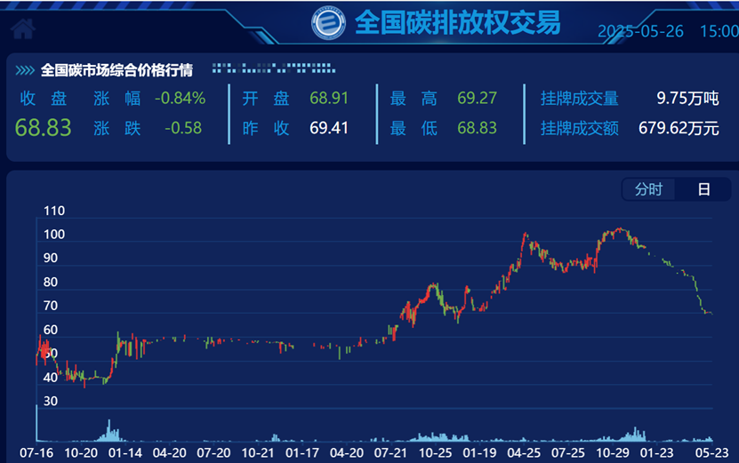 但进入2025年以来,全国碳市场价格连续大跌。上海环境能源交易所数据显示,截至5月26日,全国碳市场收盘价为68.83元/吨,年内下跌29%。特别是4月下旬,碳价加速下行,月内下跌超17%。