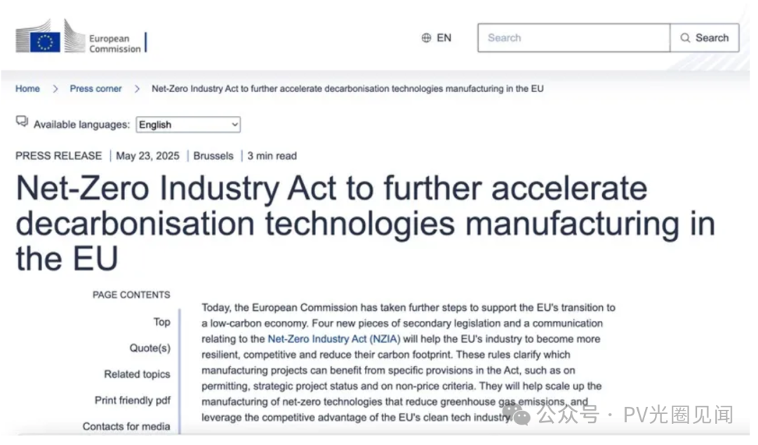 该新规属于《净零工业法案》(Net-Zero Industry Act,简称 NZIA)下的二级立法,将于2026年在欧盟成员国全面实施,将进一步促进欧洲内部生产太阳能光伏和其他清洁技术。