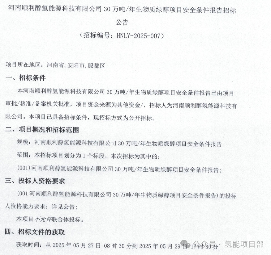 5月27日,河南顺利醇氢能源科技有限公司30万吨/年生物质绿醇项目安全条件报告招标: