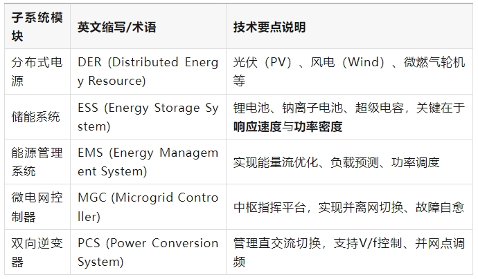 Microgrid 定义与分类**微电网(Microgrid)指的是由分布式能源(Distributed Energy Resource, DER)、储能系统(Energy Storage System, ESS)、负载(Load)与能量管理系统(Energy Management System, EMS)构成的局部电力系统,可在并网(Grid-connected)或离网(Islanded)**模式下灵活运行。