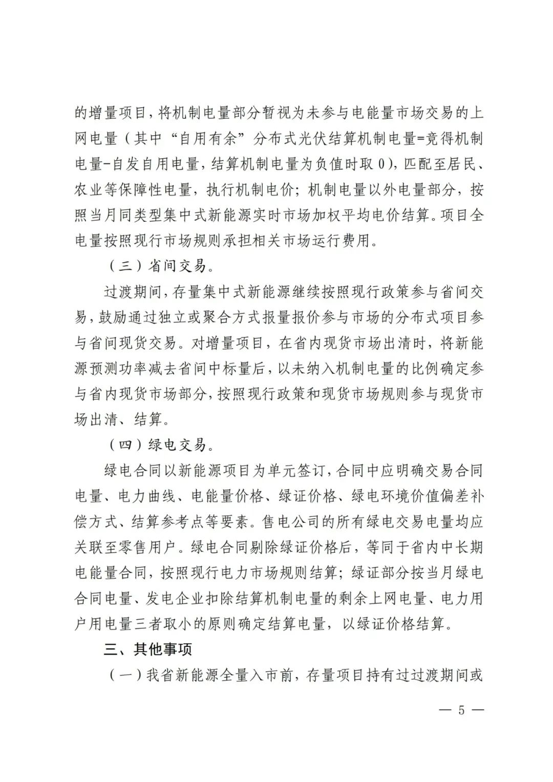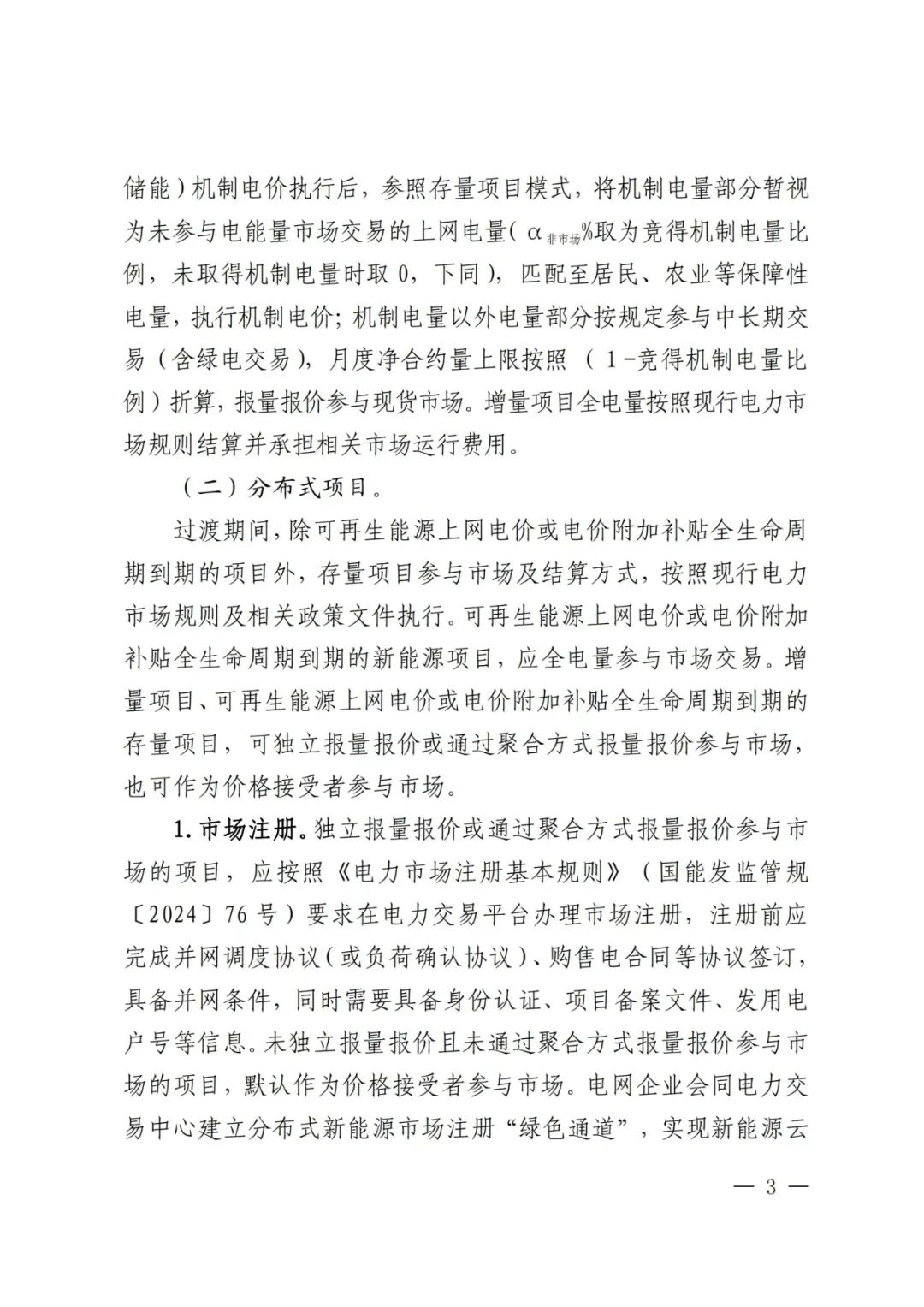 通知规定,存量项目(含配建储能)参与电力市场交易按照现行电力市场规则规定执行,增量项目(含配建储能)在机制电价执行前,按规定参与中长期交易(含绿电交易),按现行电力市场规则全电量报量报价参与现货市场。