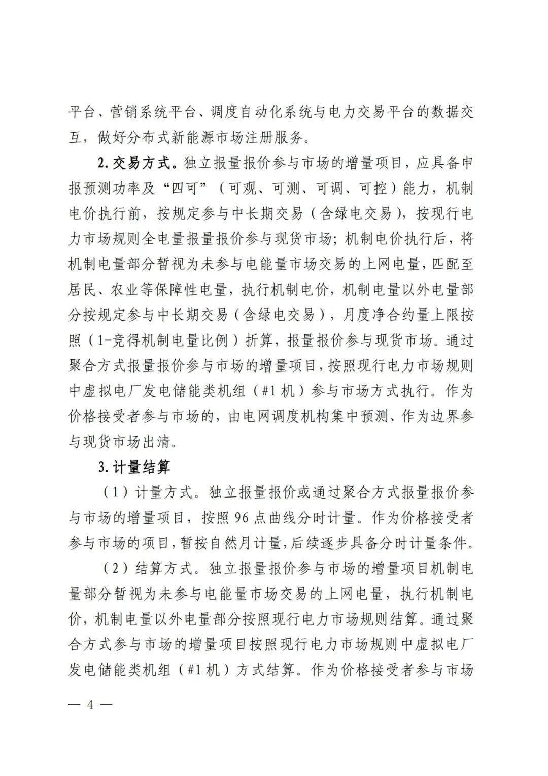 分布式光伏存量项目参与市场及结算方式,按照现行电力市场规则及相关政策文件执行,增量项目可独立报量报价或通过聚合方式报量报价参与市场,也可作为价格接受者参与市场。