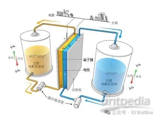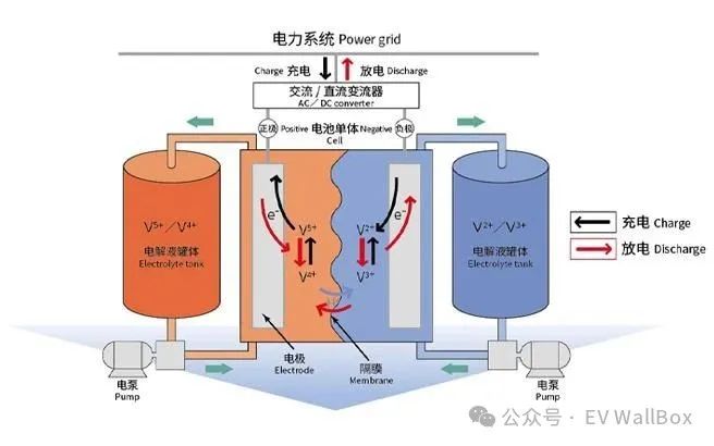 全钒液流电池(Vanadium Redox Flow Battery, VRFB):以钒离子为电解质,通过可逆氧化还原反应存储能量。
