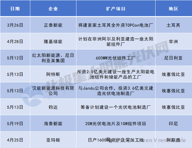 7家企业宣布海外扩产,重点布局中东、非洲及印尼: