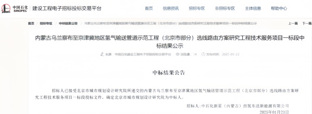 图丨内蒙古乌兰察布至京津冀地区氢气输送管道北京段中标结果公布