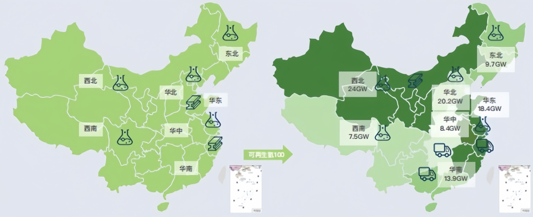 产能提升方面,“西氢东送”日渐增长的需求将倒逼西部地区扩大可再生氢装机布局。根据《开启绿色氢能新时代之匙:中国2030年“可再生氢100”发展路线图》预测,2030年西北地区需建成24吉瓦电解槽,实现每年可再生氢产量264万吨;西南地区需建成7.5吉瓦的电解槽装机,达到每年82万吨的可再生氢产量。此外,随着西部地区加速布局可再生氢,将进一步拉近可再生氢与天然气制氢以及化工行业副产氢的成本经济性差距,充分实现可再生氢对副产氢等的逐步替代,推动产业转型升级。