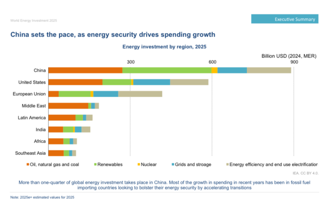 中国巩固了其作为全球最大单一能源投资国的地位,其中太阳能吸引的资本超过任何其他技术。比罗尔补充道:“2015年,国际能源署发布首份《世界能源投资报告》时显示,中国能源投资仅略超美国。如今,中国已是全球最大能源投资国,能源领域投资是欧盟的两倍,几乎相当于欧盟和美国的总和。”