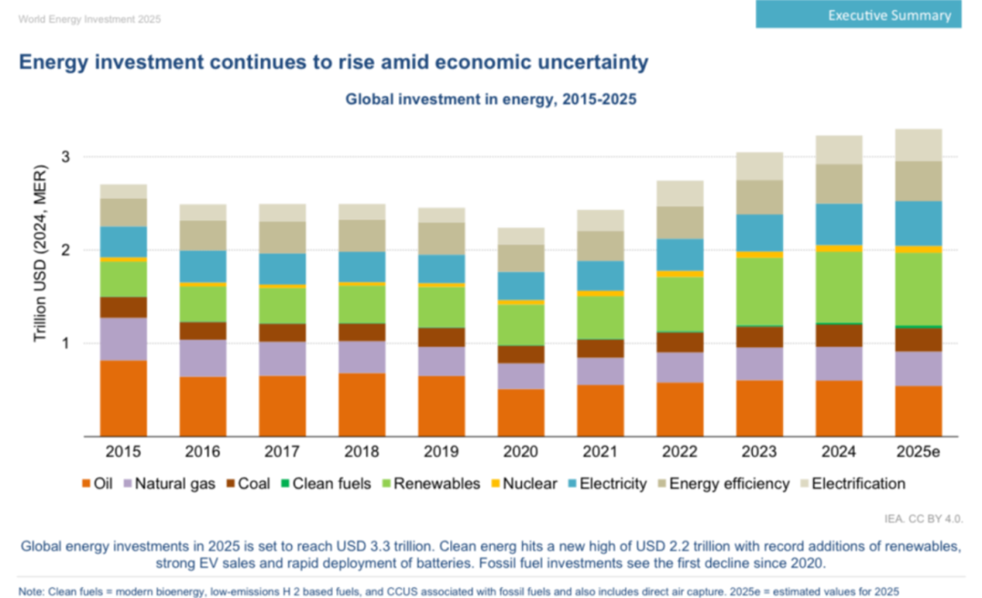 尽管地缘政治紧张局势加剧且经济不确定性更强,但国际能源署(IEA)在昨日发布的第十版《世界能源投资报告》显示,2025年能源行业投资将增至3.3万亿美元,较2024年增长2%,其中清洁能源技术吸引的资金(2.2万亿美元)是化石燃料的两倍。这一数据充分彰显了全球能源投资向清洁化转型的决心与趋势。